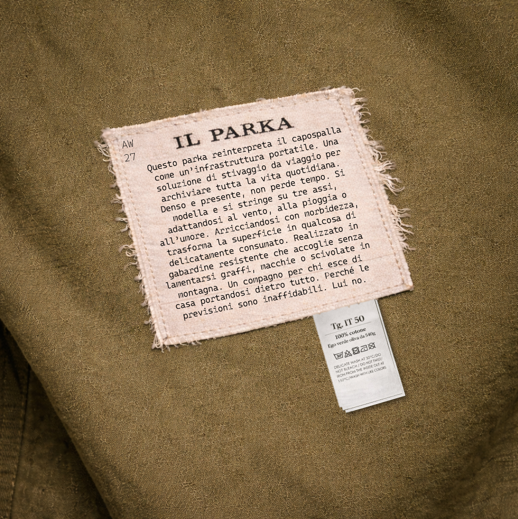 Questo parka reinterpreta il capospalla come un'infrastruttura portatile. Con una vita bassa e morbida, l'intero pannello frontale inferiore si trasforma in un'unica ampia tasca. Una soluzione di stivaggio da viaggio per archiviare tutta la vita quotidiana. Le ampie tasche a filo con patta asimmetrica si dividono ordinatamente in scomparti per telefono, portafoglio e chiavi, mentre una tasca nascosta con cerniera si trova discretamente all'altezza del cuore per gli oggetti più importanti.