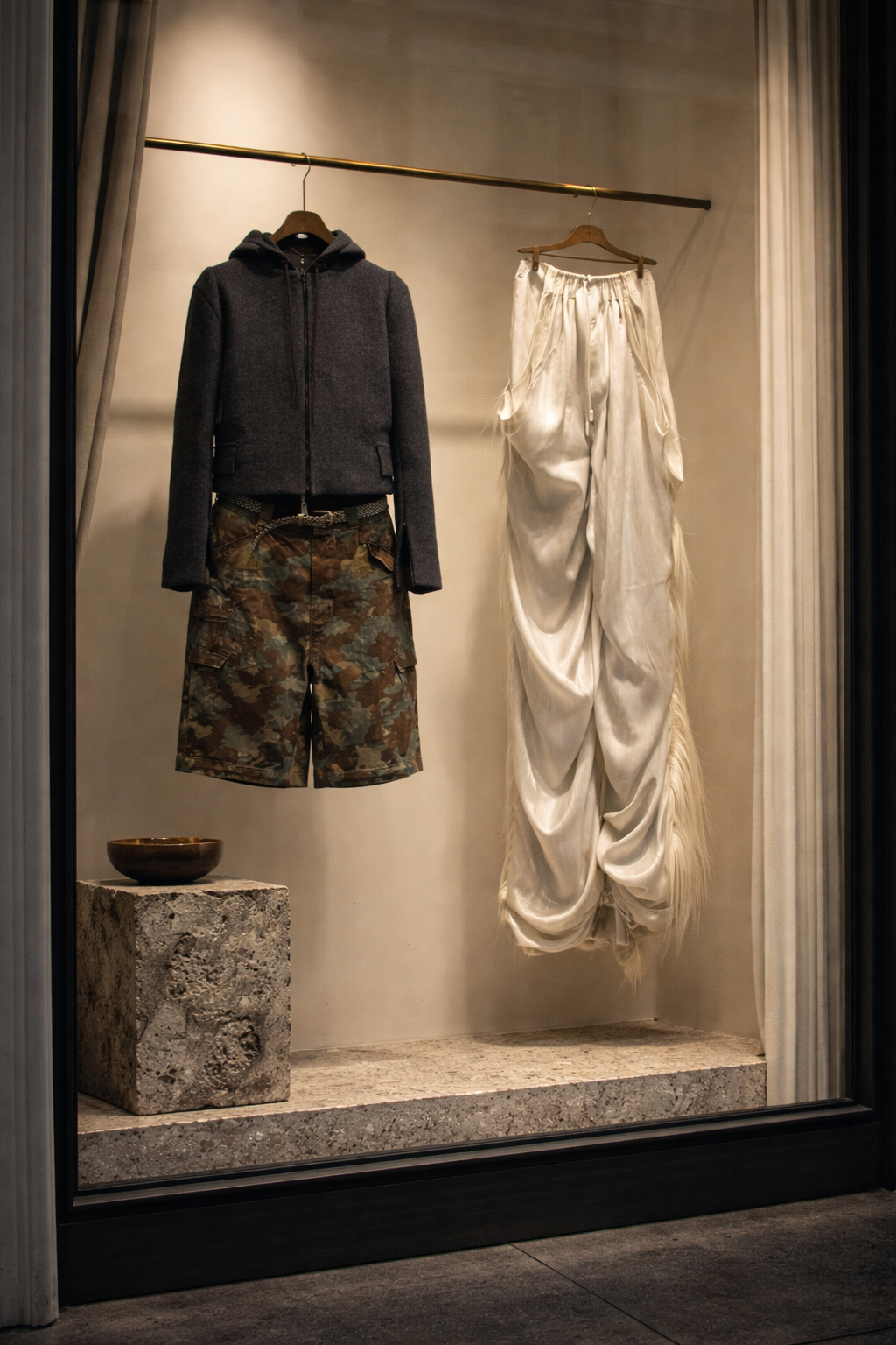 Behind the shop is the studio. This is where patterns are cut, fabrics are sourced, and the garments are conceived, developed, sampled, and refined. Before production, every piece is worn and tested for daily life. Garments are trialled in movement. Proportions are corrected through use. Only garments that perform in reality are released. The studio is also where we, as siblings, work in dialogue. One eye technical, one eye spatial. One thinking in proportion, one in silhouette. Its the synergy between us in the studio that shapes the Buccia wardrobe.